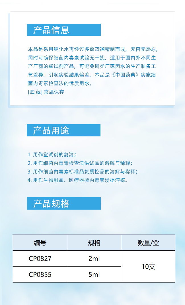 用作鲎试剂的复溶;用作细菌内毒素检查法供试品的溶解与稀释;用作细菌内毒素标准品货质控品的溶解与稀释;用作生物制品、医疗器械内毒素浸提溶媒。