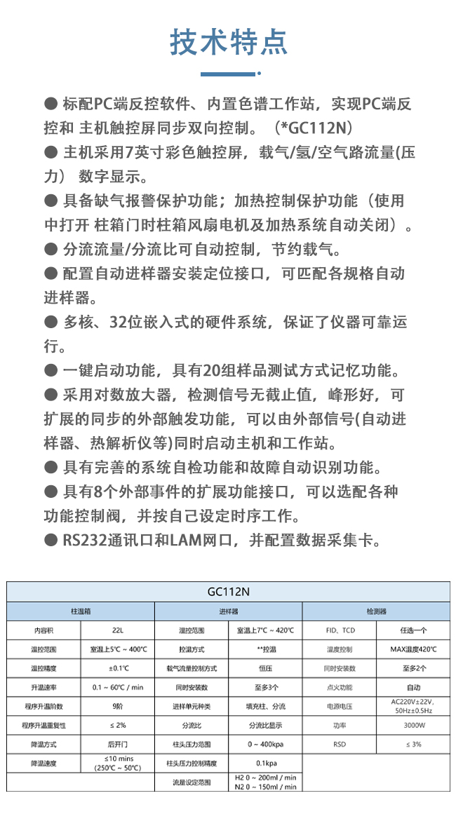 压力设定范围0~400KPa,柱箱温度范围室温上5℃~400℃,流量设定范围氢气0~200ml/min、氮气0~150ml/min