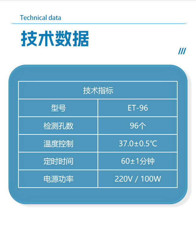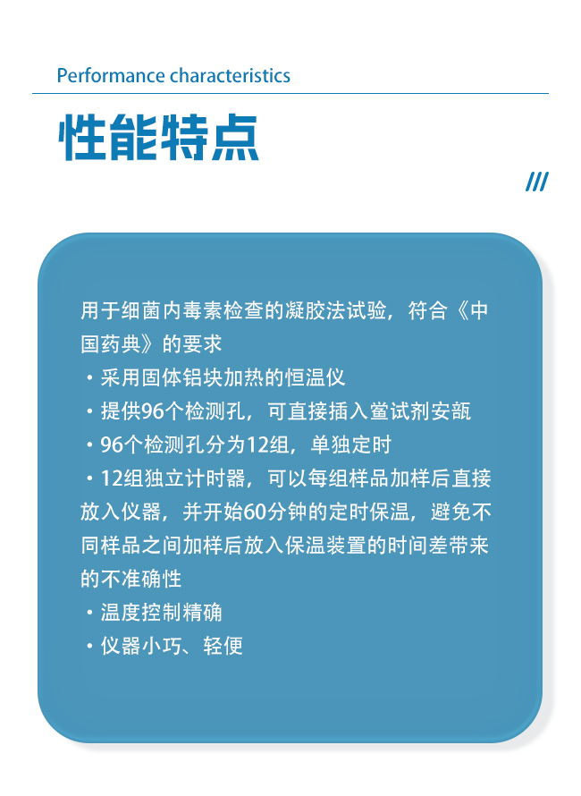 凝胶法,96 孔,12 组独立计时,干式恒温加热。符合 CHP 要求。