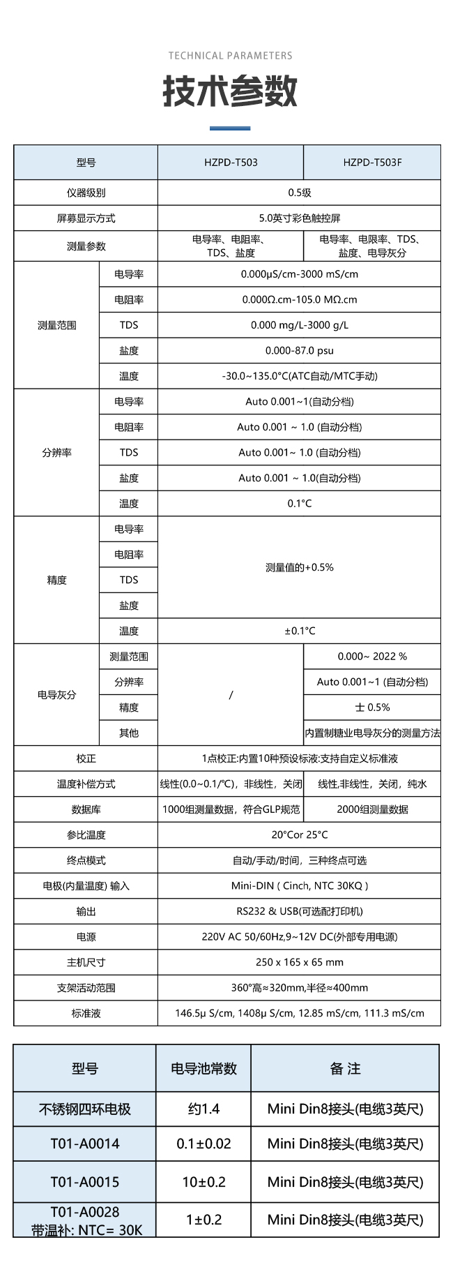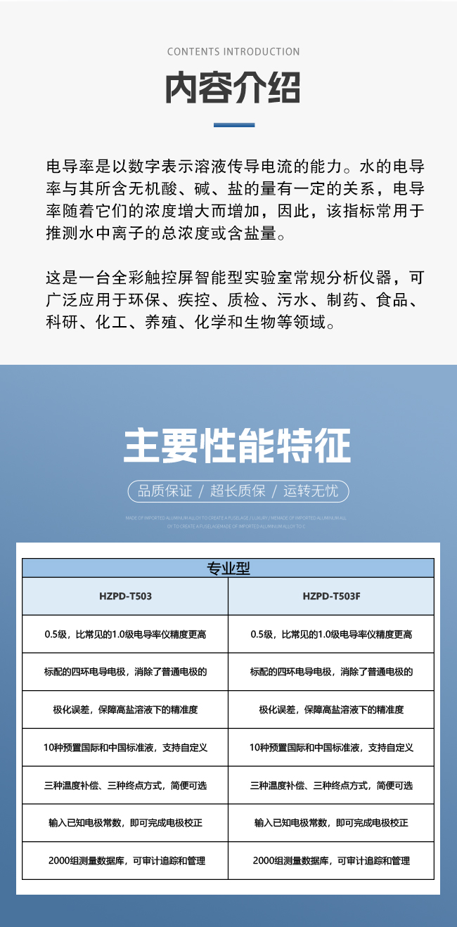 0.5级,比常见的1.0级电导率仪精度更高 标配的四环电导电极,消除了普通电极的 极化误差,保障高盐溶液下的精准度