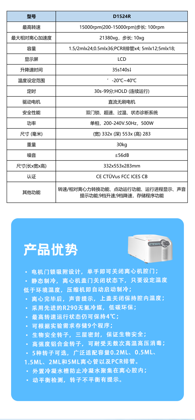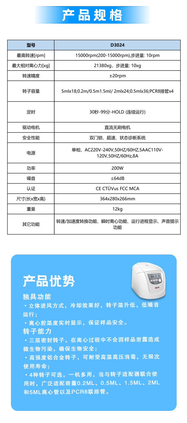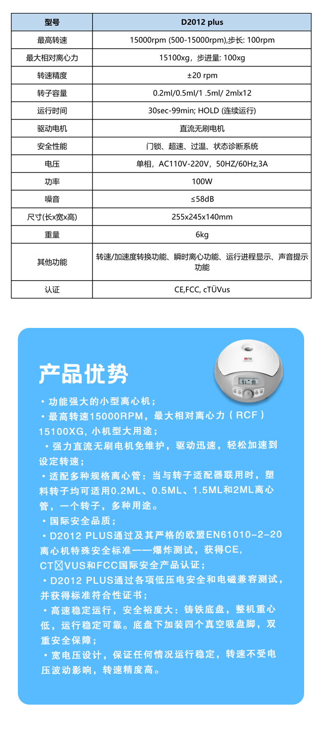最高转速15000rpm (500-15000rpm), 步长:100rpm,最大相对离心力15100×g,步进量:100×g,转子容量0.2ml/0.5ml/1.5ml/ 2ml×12,功率100W