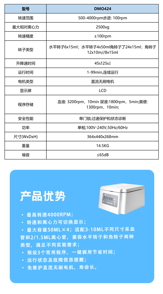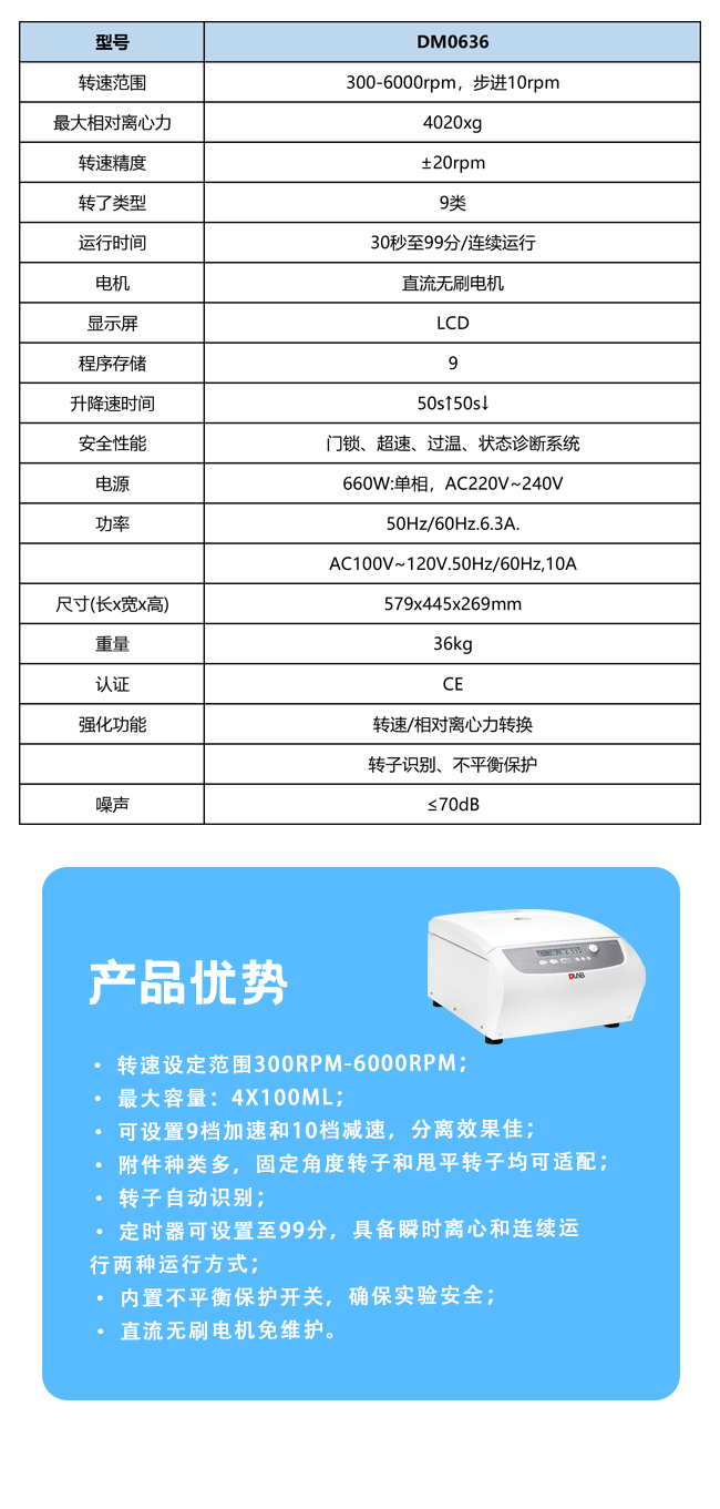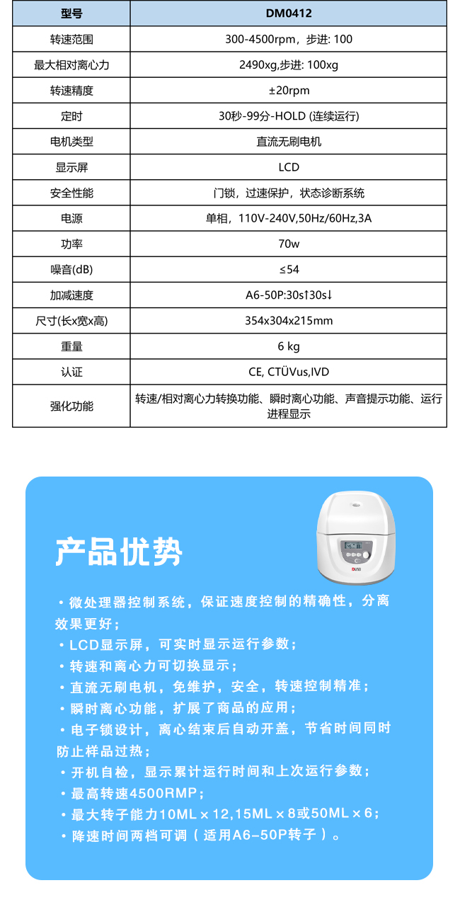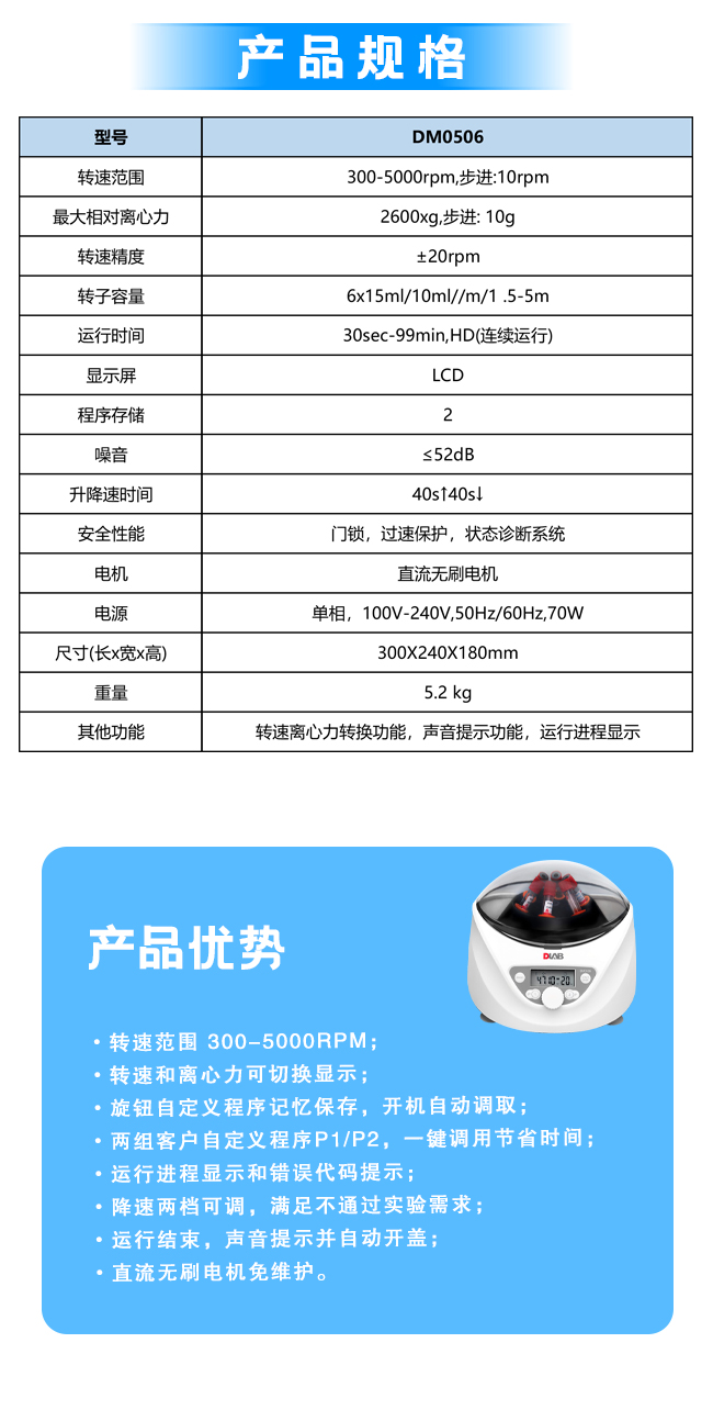 转速范围300-5000rpm, 步进:10rpm,最大相对离心力2600xg, 步进: 10g,功率70w