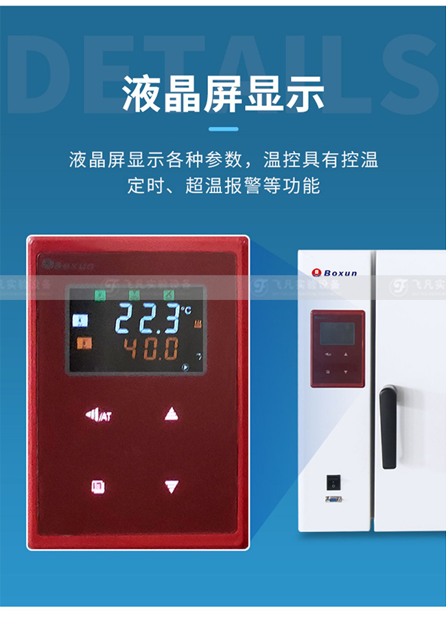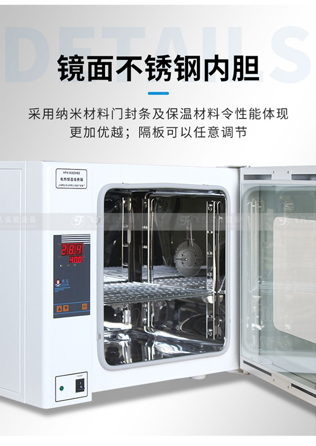 圆弧型结构设计,进口电机和风叶 镜面不锈钢内胆,搁架可以调整 控温范围:室温+5℃—65℃ 分辨率:0.1℃ 控时范围:0~999分钟